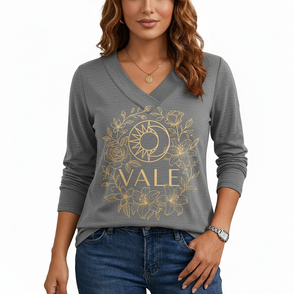 Artistic Graphic Design: Features an elegant gold-tone “VALE” print intertwined with a celestial sun-and-moon motif and intricate floral accents.