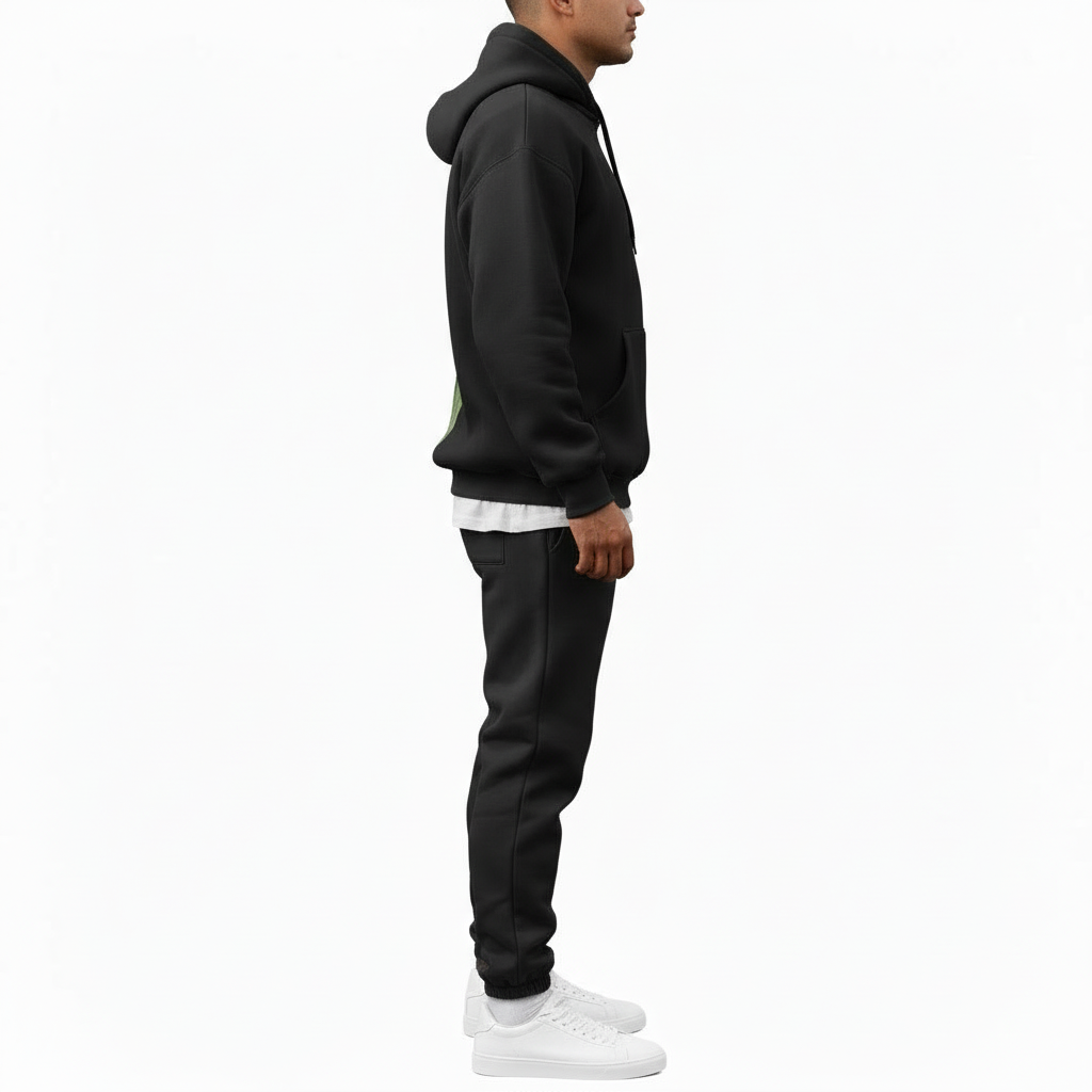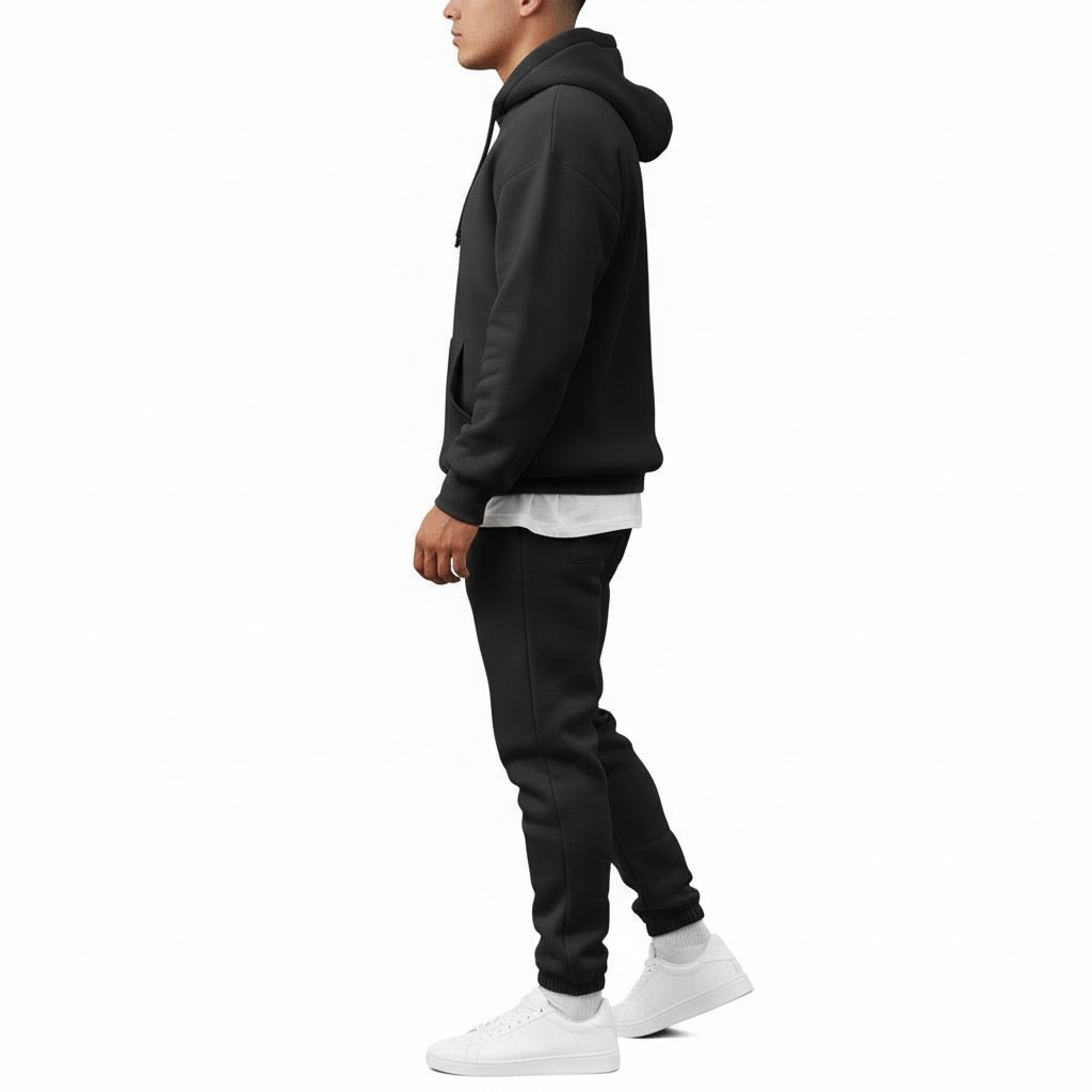 Fit: Modern athletic-leisure fit with ribbed cuffs on the joggers and a structured, cozy hoodie for a clean silhouette.