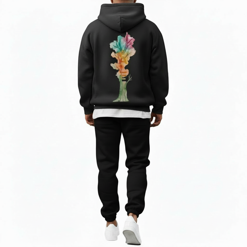 Design: Features a unique watercolor “VALE” tree graphic on the back, blending artistic pastel tones with high-end streetwear aesthetics.
