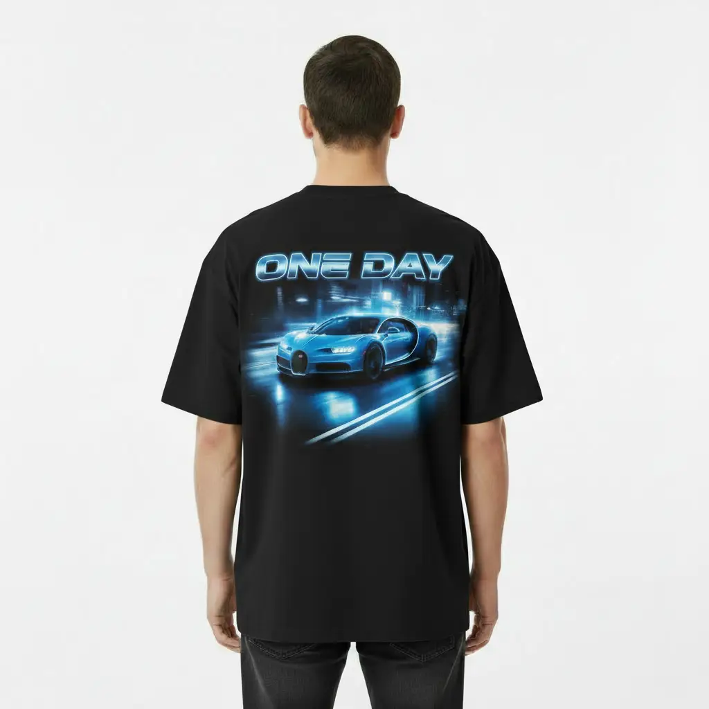 Back Graphic: Features a high-definition Bugatti supercar illustration paired with bold “ONE DAY” chrome-style typography, capturing the essence of automotive ambition.