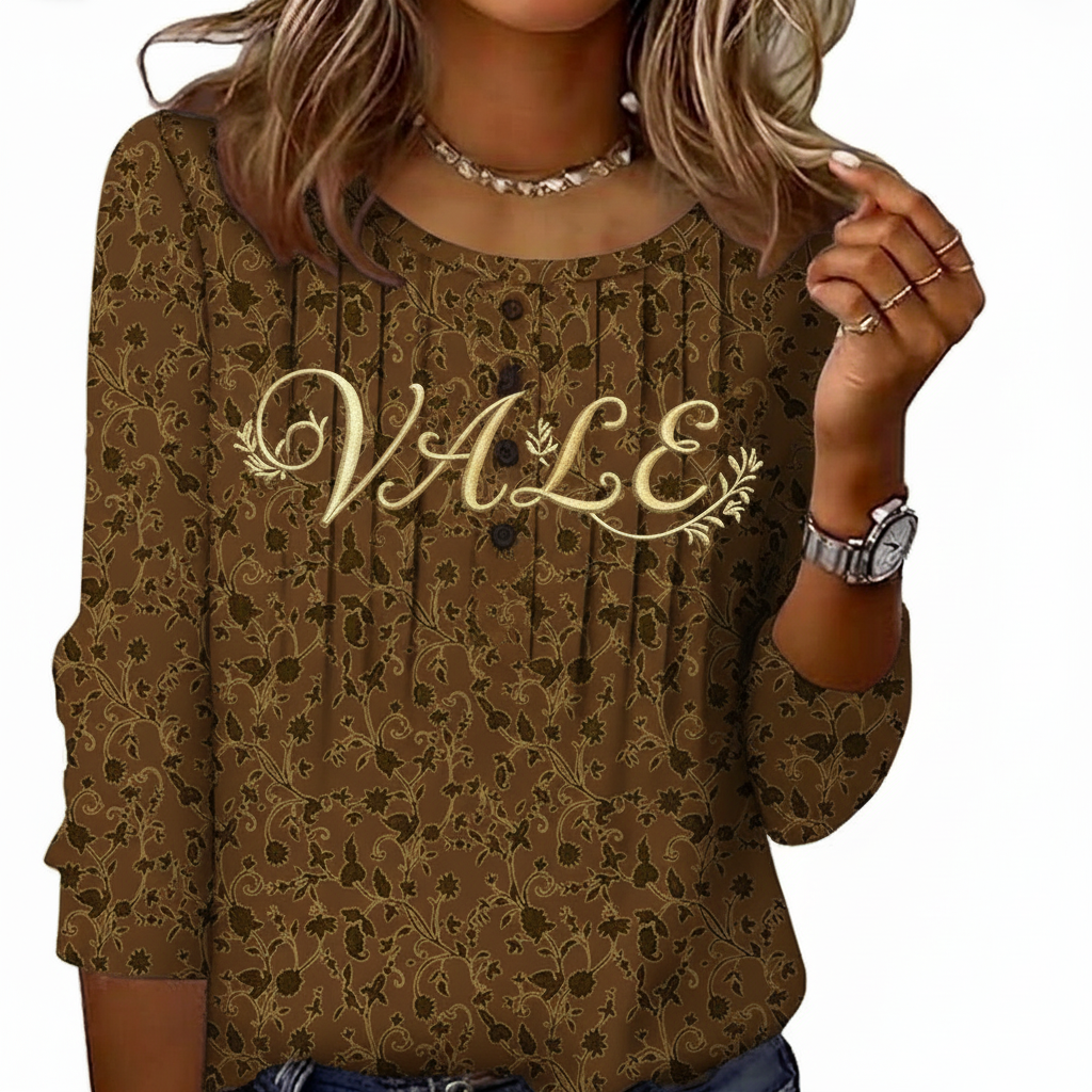 Elegant Design: Features an intricate vintage floral vine pattern across the fabric, paired with a sophisticated “VALE” gold-tone script embroidery on the chest.