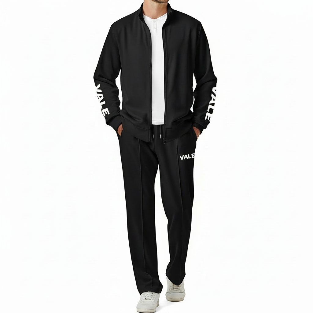 Signature Branding: Distinctive “VALE” bold typography featured on the jacket sleeves and the upper thigh of the joggers.