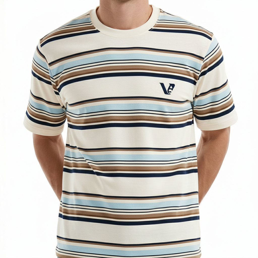 Design: Stylish Variegated Horizontal Stripes with a minimalist chest logo for a contemporary aesthetic.