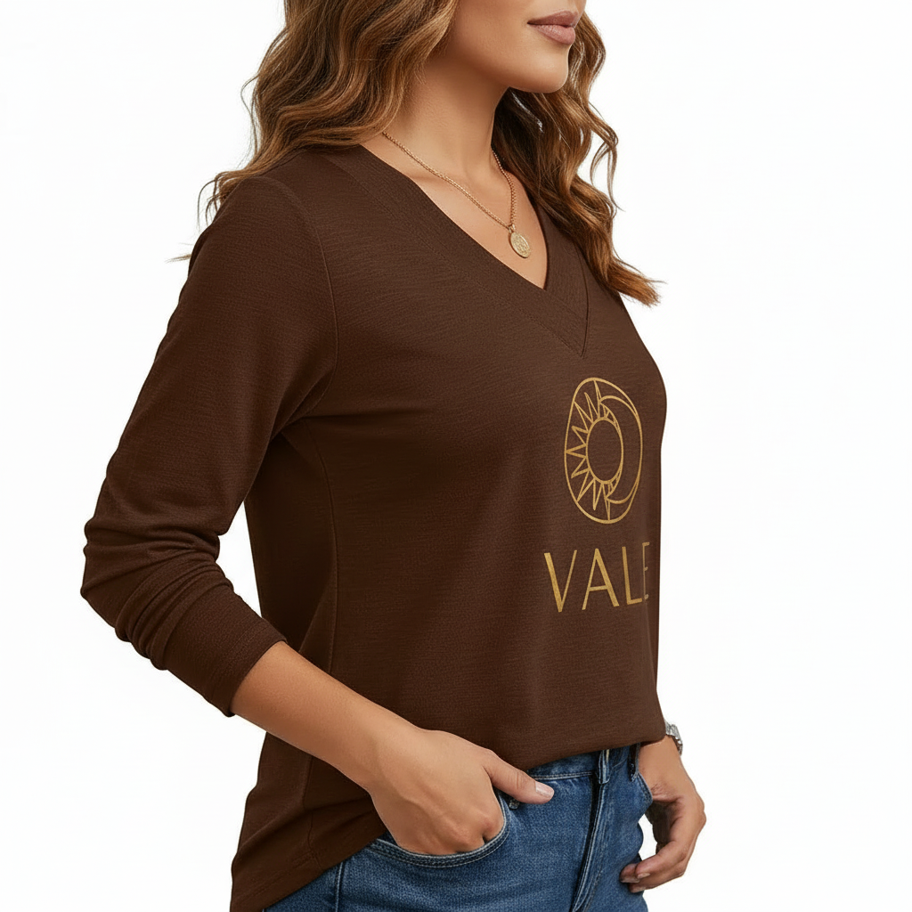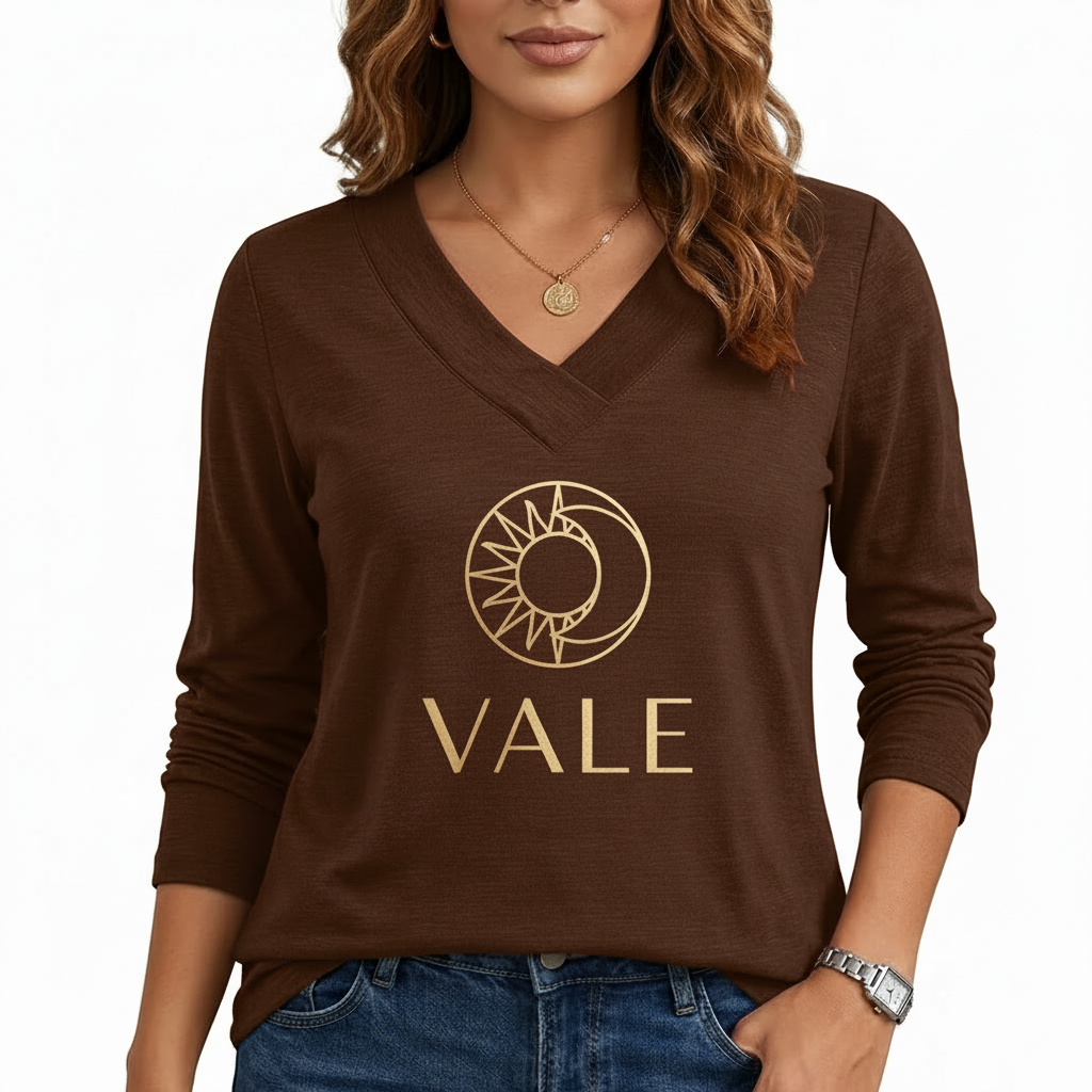 Design: Features a sophisticated gold-toned celestial sun and moon emblem with minimalist “VALE” typography.