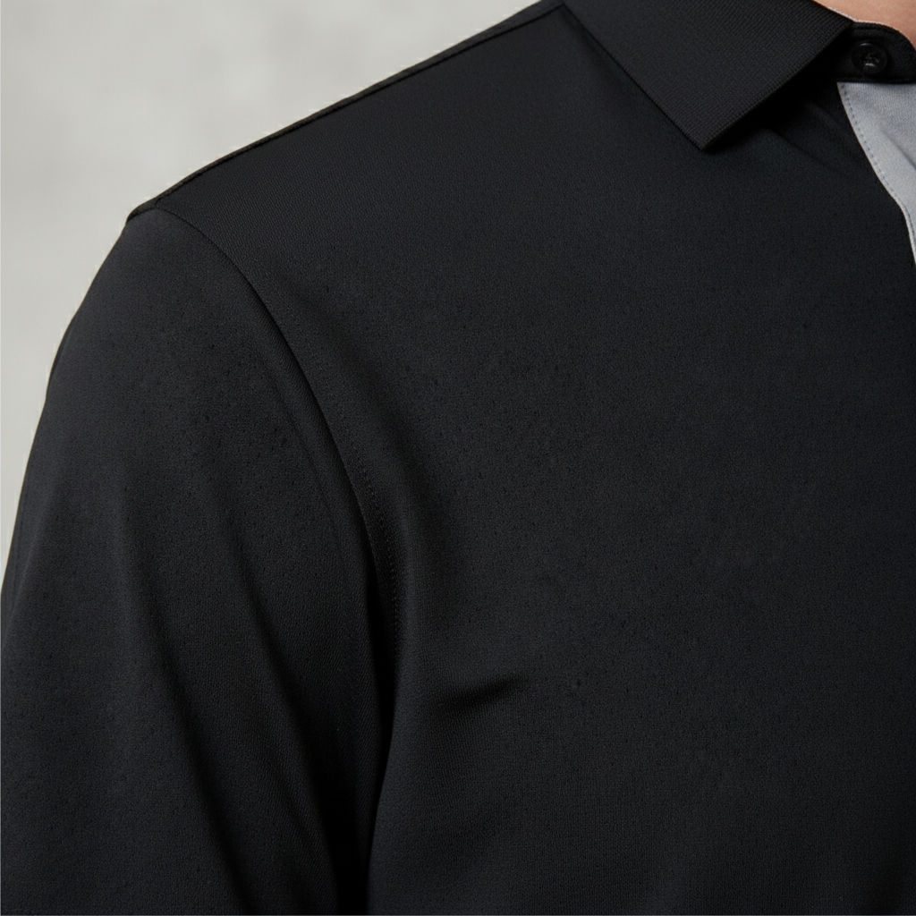 Neckline: A precision-stitched Three-Button Placket and structured collar, offering a clean, adjustable look for formal or casual settings.