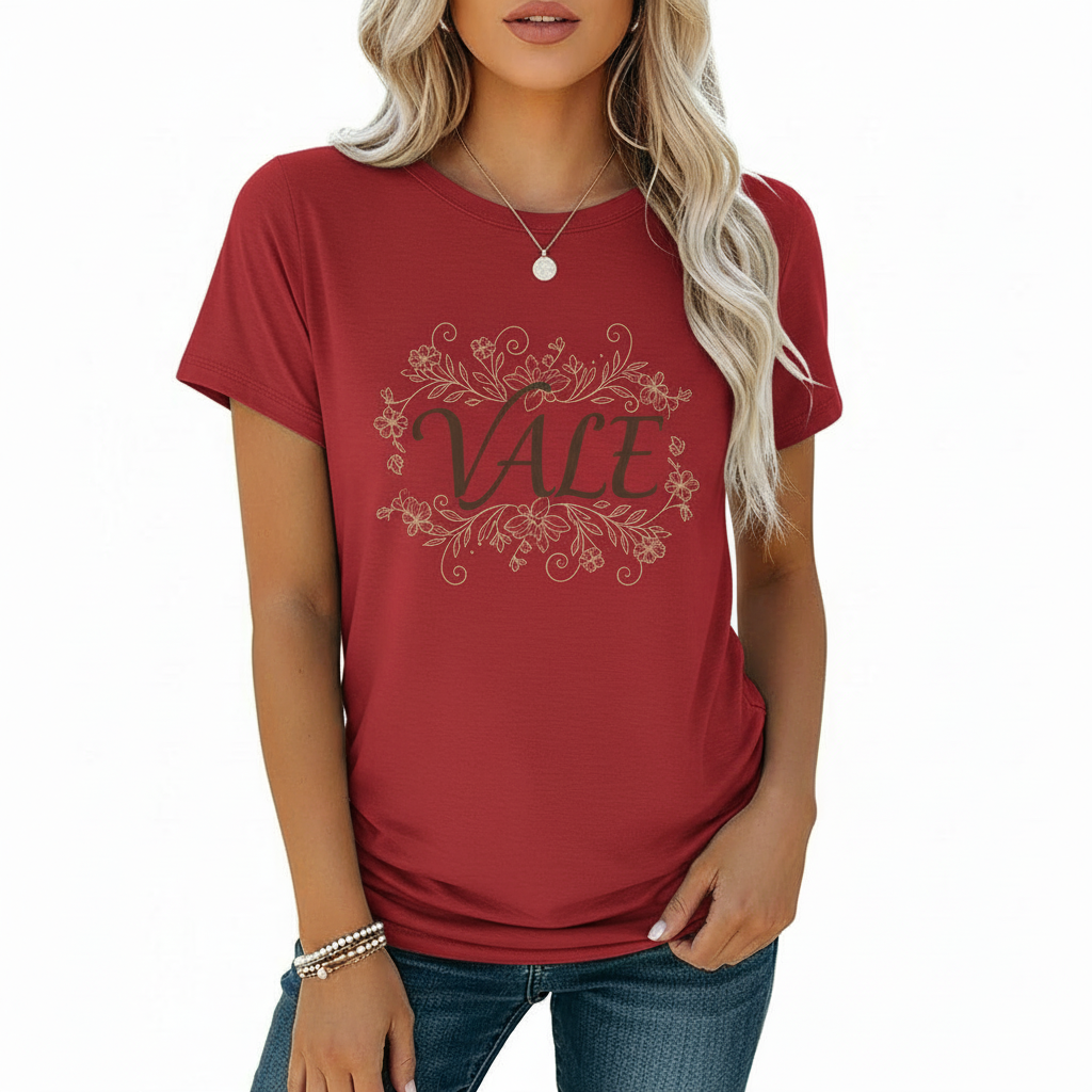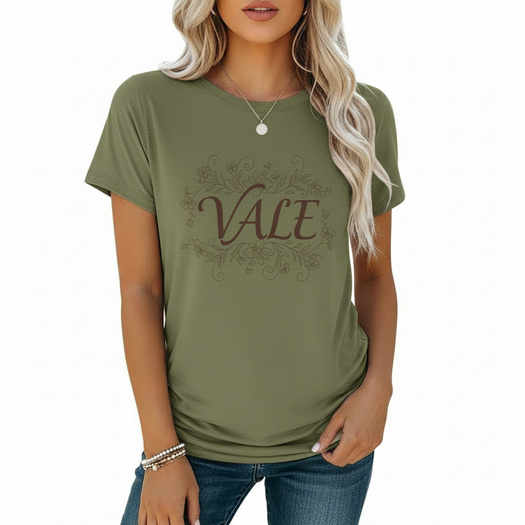Design: Features an elegant “VALE” script logo encased in a delicate, earthy-toned floral wreath.