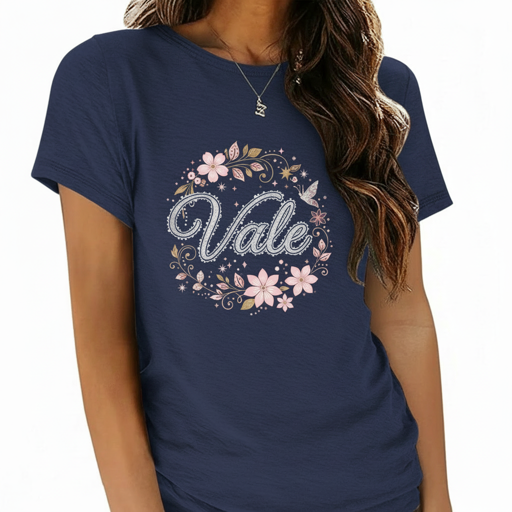 Artistic Design: Features a “Vale” signature script in an intricate lace-style font, encased in a hand-drawn floral wreath with butterfly and star accents.