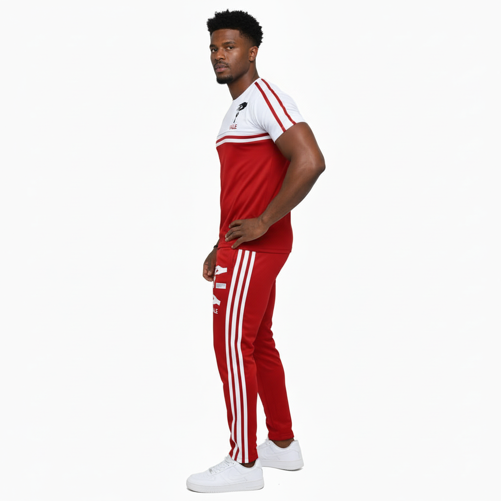 Unique Design: Eye-catching two-tone chest panel with signature “VALE” graphic branding and racing stripes on sleeves and legs.