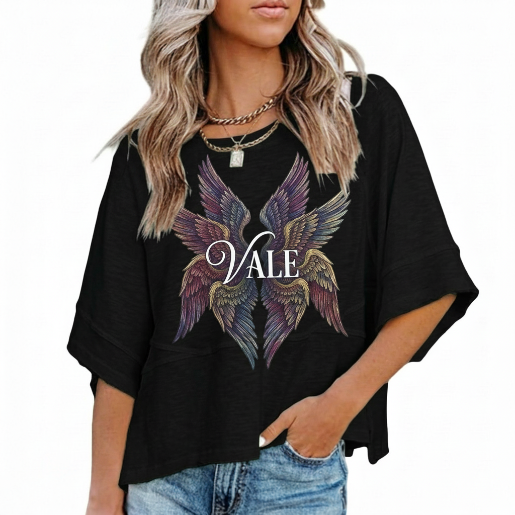 Design: Features a striking, high-definition multi-layered wing graphic (Seraphim style) with elegant “VALE” typography centered on the chest.