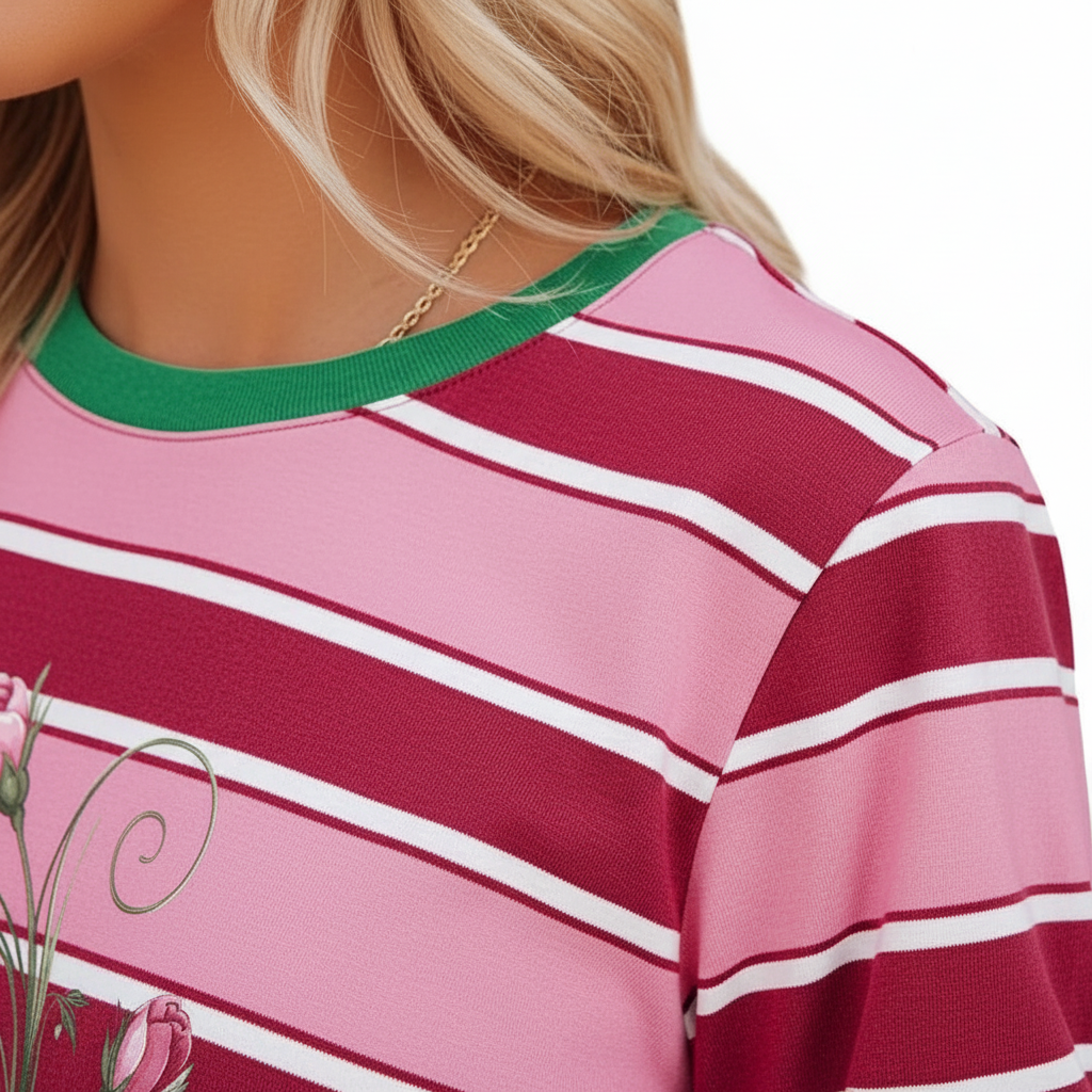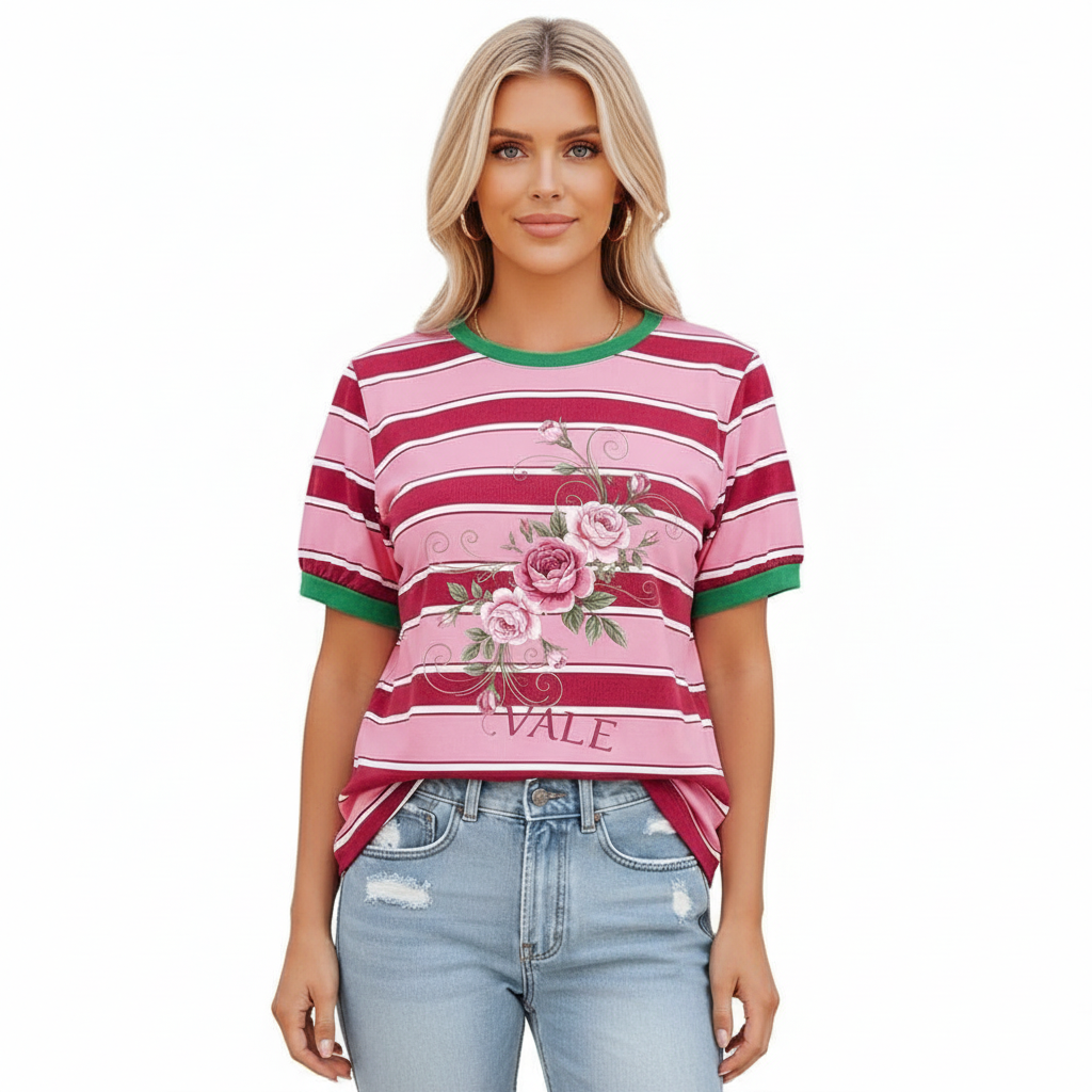 Women’s Cotton Striped Rose Graphic T-Shirt