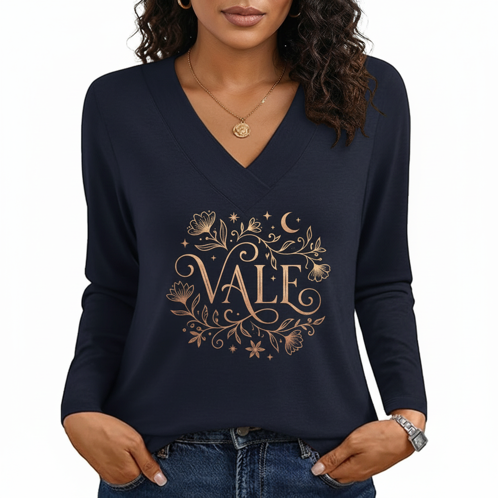 Design: Features a sophisticated gold-tone “VALE” logo centered within a celestial floral wreath, including moon and star accents.