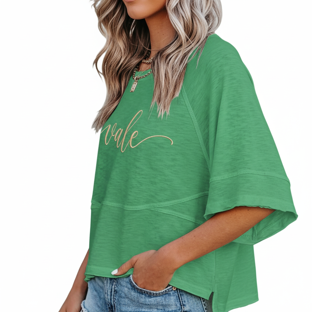Design: Features an elegant gold-foil “vale” script across the chest, adding a touch of sophisticated flair to a casual staple.