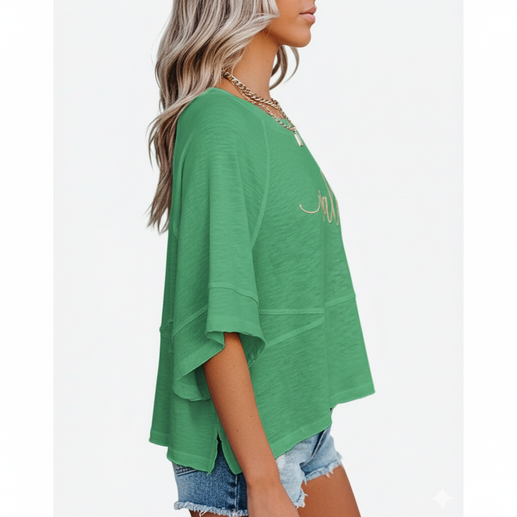 Fit: Relaxed, oversized silhouette with dropped shoulders and a stylish mid-body horizontal seam for a modern, layered look.